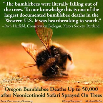 Currently, beekeeper are losing up to 50% of their bee hives and instead of proposing an immediate ban on GM crops and neonicotinoids, our selected officials allow giant biotech including Monsanto, Syngenta and Bayer spend billions of dollars promoting and selling their toxic insecticides and GM foods.